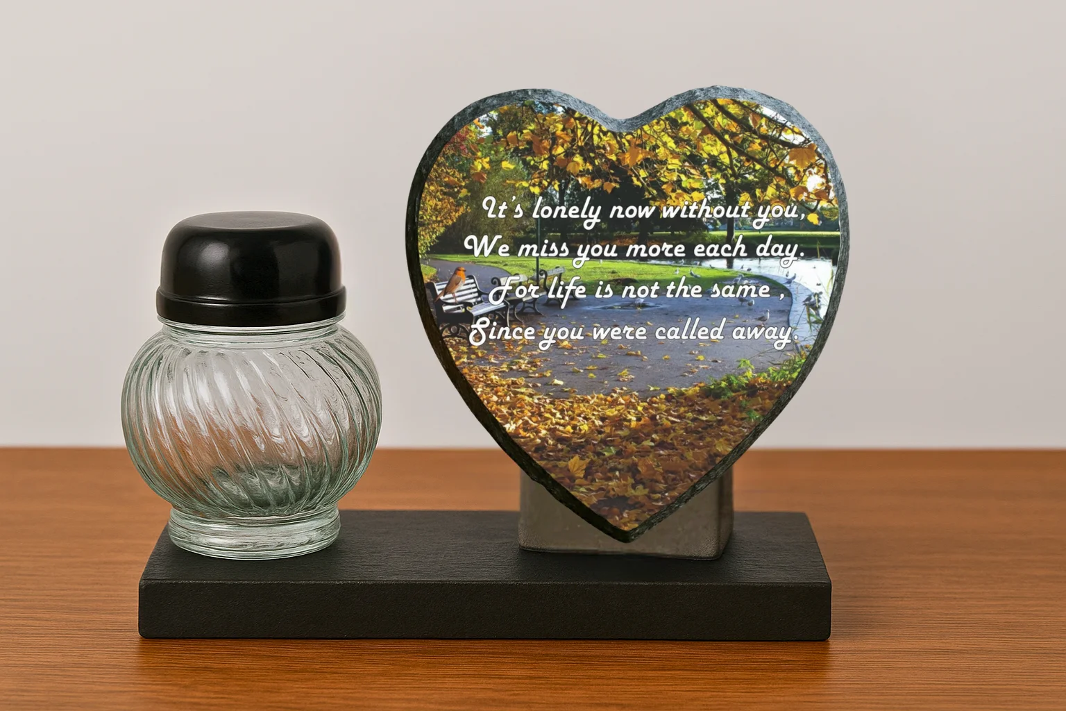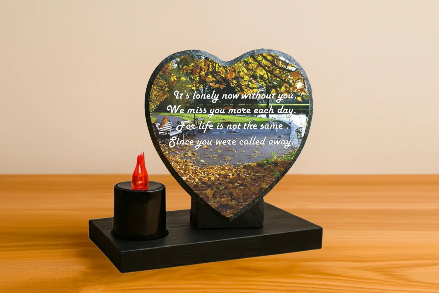 Our memorial plaques are made from real slate with a natural stone uneven texture edge. Slight variations in the size of slate and natural imperfections or pits in the surface, which may be visible in the final print, all give each slate its own distinct and unique features.
