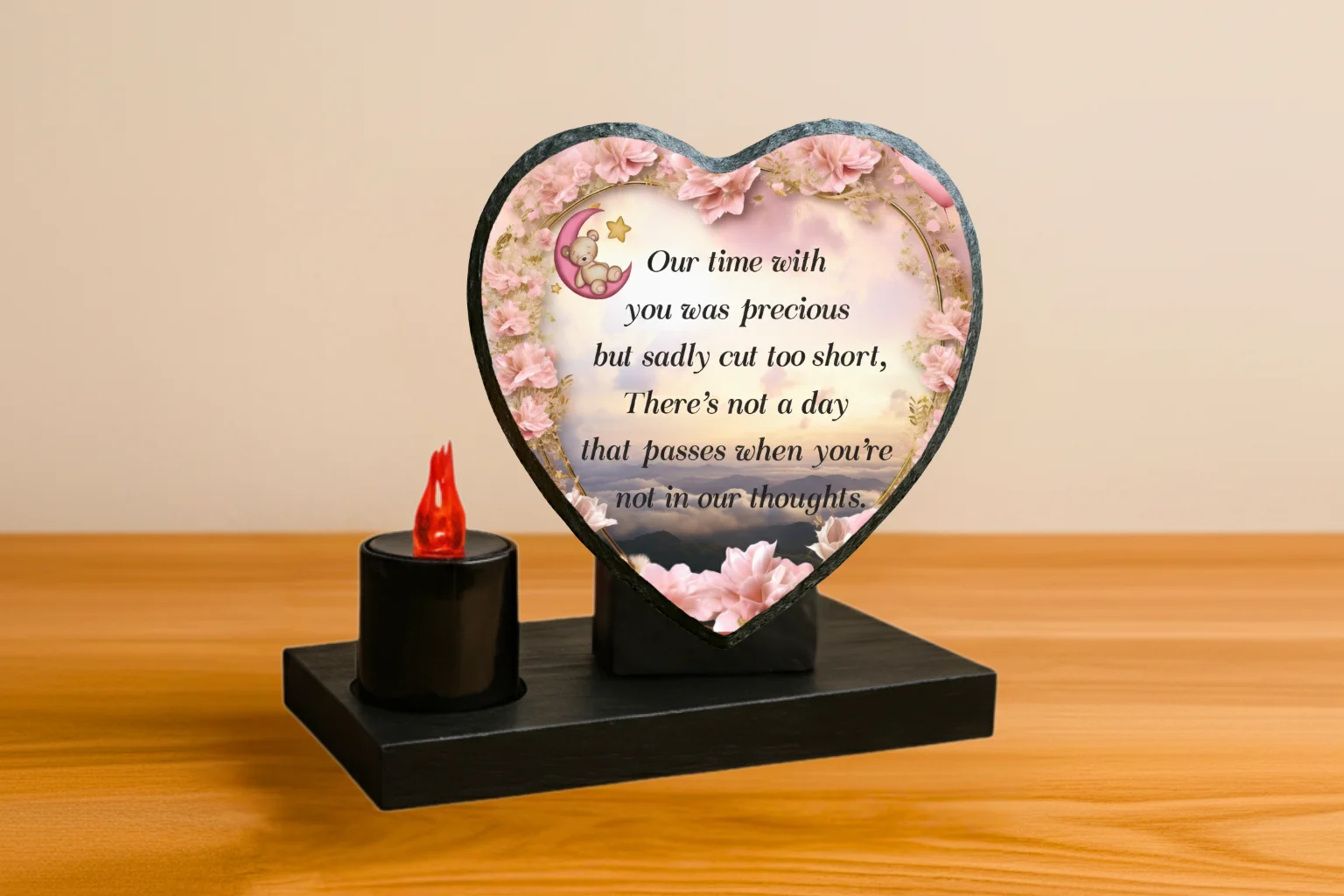 Our memorial plaques are made from real slate with a natural stone uneven texture edge. Slight variations in the size of slate and natural imperfections or pits in the surface, which may be visible in the final print, all give each slate its own distinct and unique features.