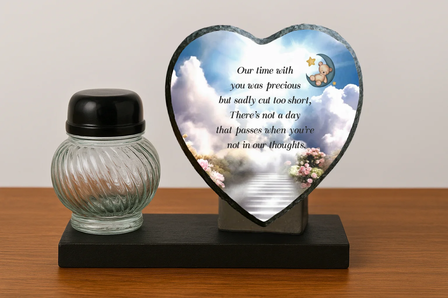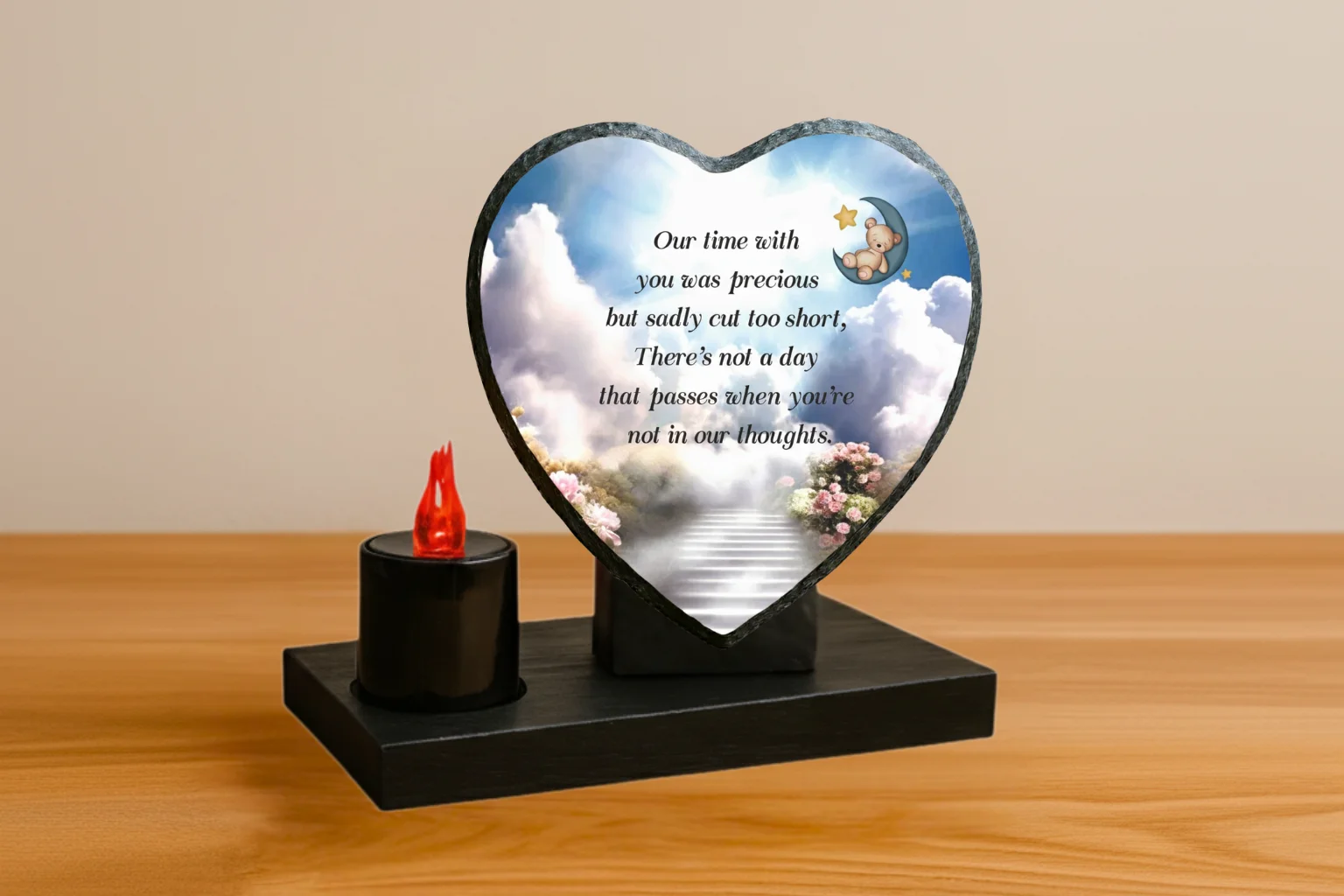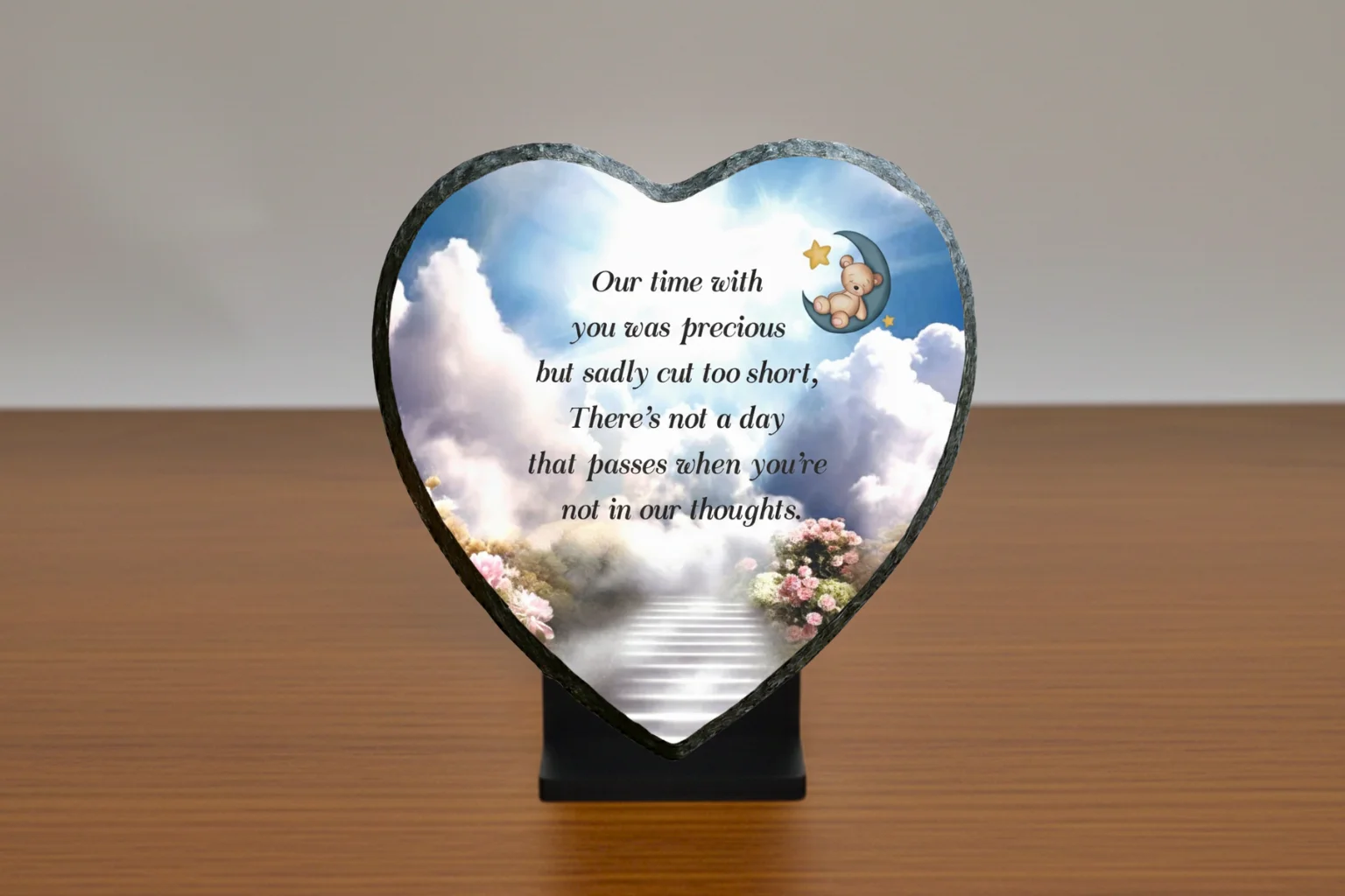 Our memorial plaques are made from real slate with a natural stone uneven texture edge. Slight variations in the size of slate and natural imperfections or pits in the surface, which may be visible in the final print, all give each slate its own distinct and unique features.