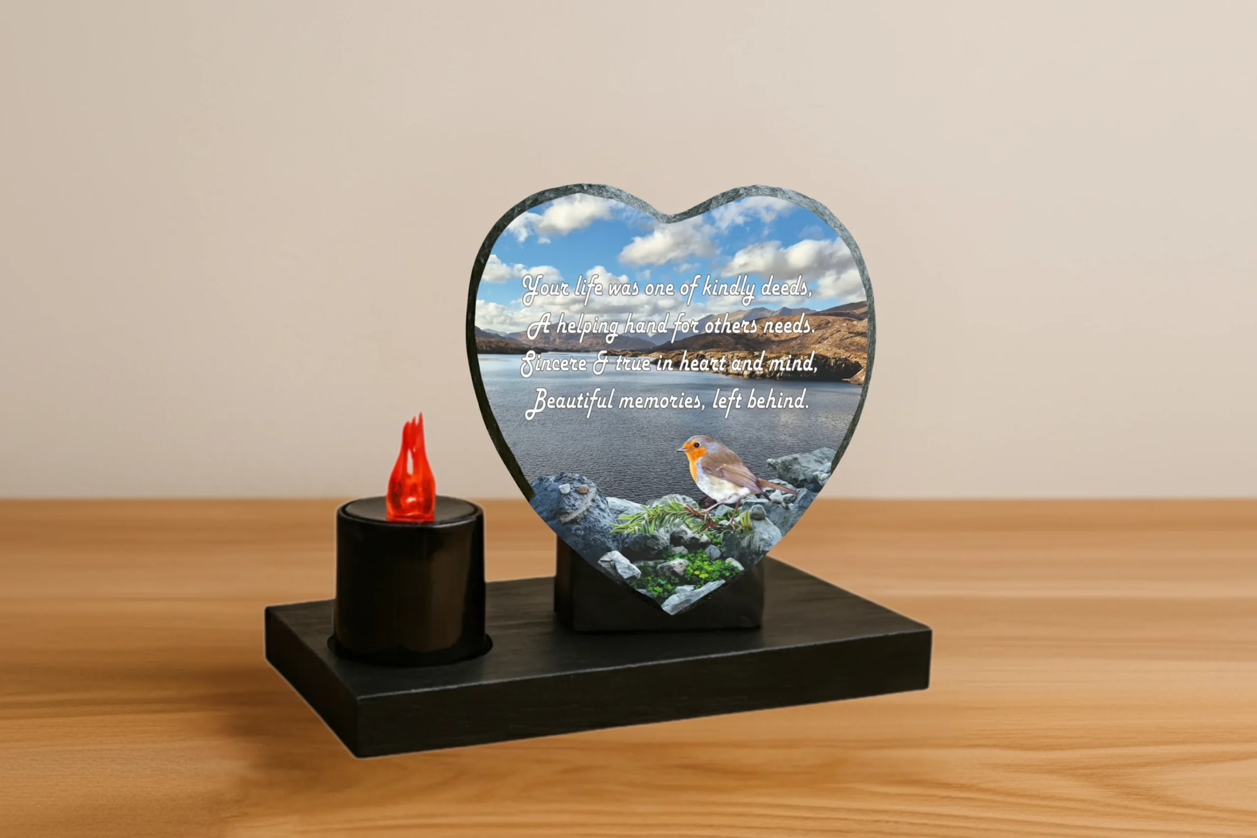 Our memorial plaques are made from real slate with a natural stone uneven texture edge. Slight variations in the size of slate and natural imperfections or pits in the surface, which may be visible in the final print, all give each slate its own distinct and unique features.