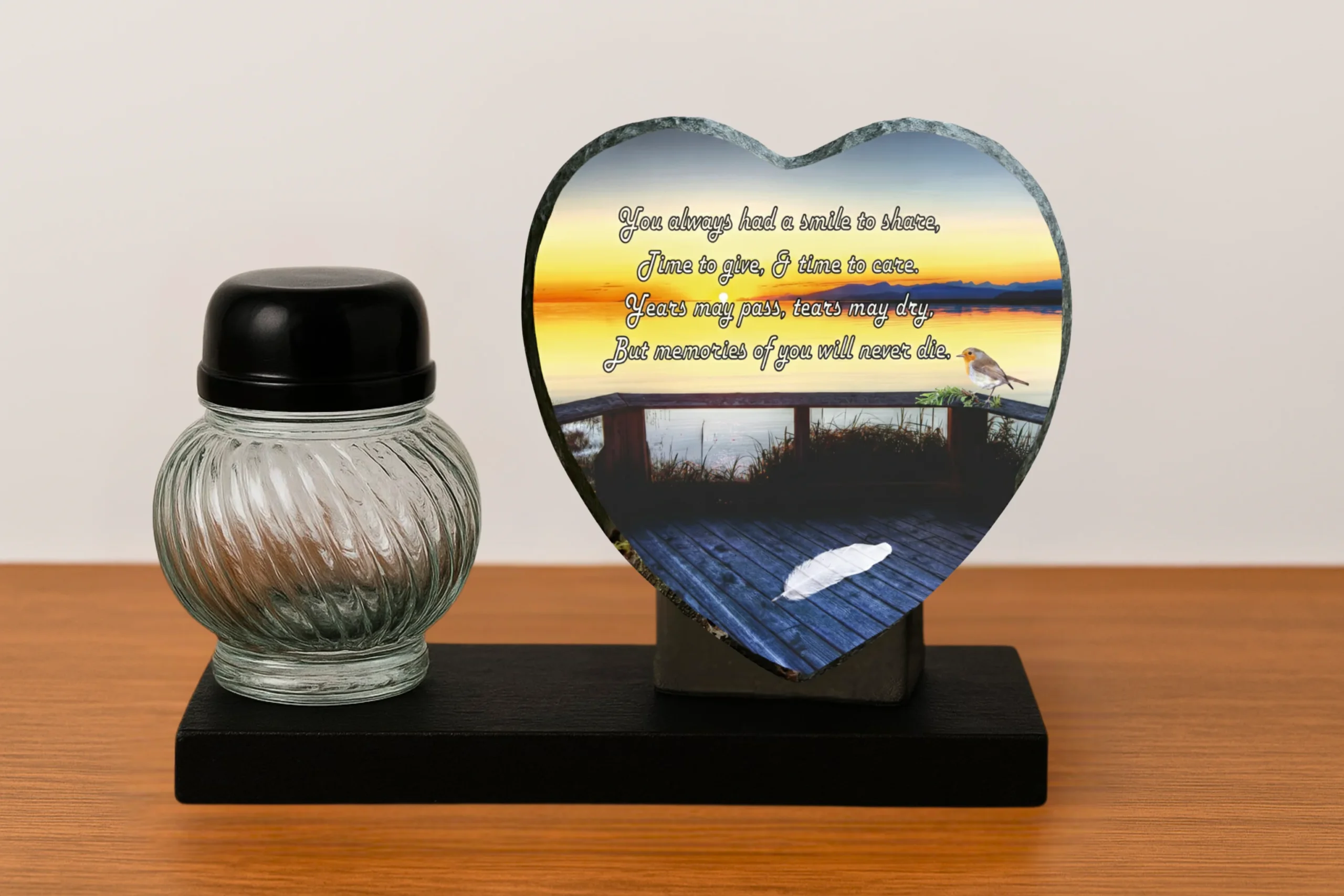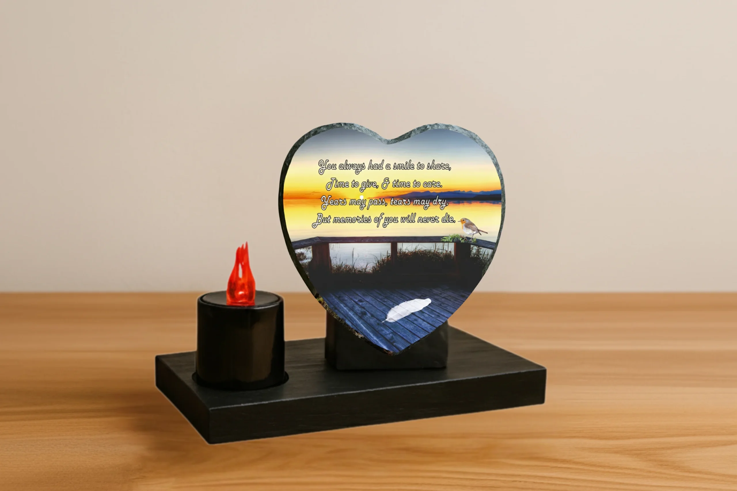 Our memorial plaques are made from real slate with a natural stone uneven texture edge. Slight variations in the size of slate and natural imperfections or pits in the surface, which may be visible in the final print, all give each slate its own distinct and unique features.