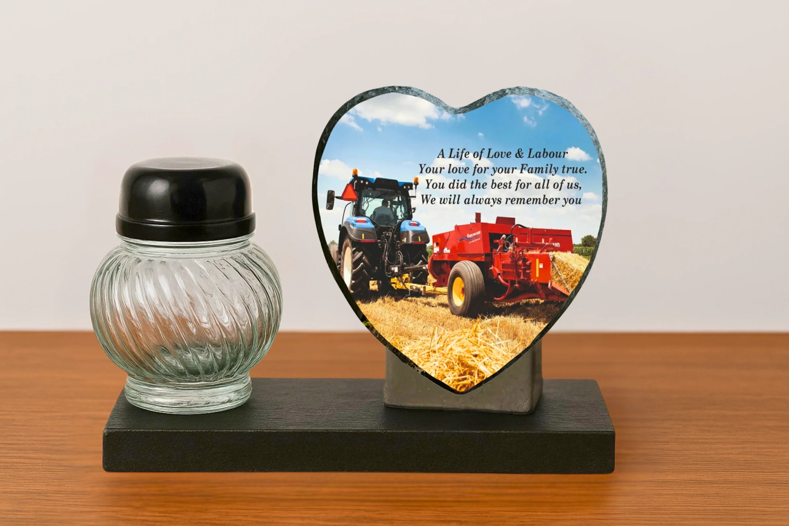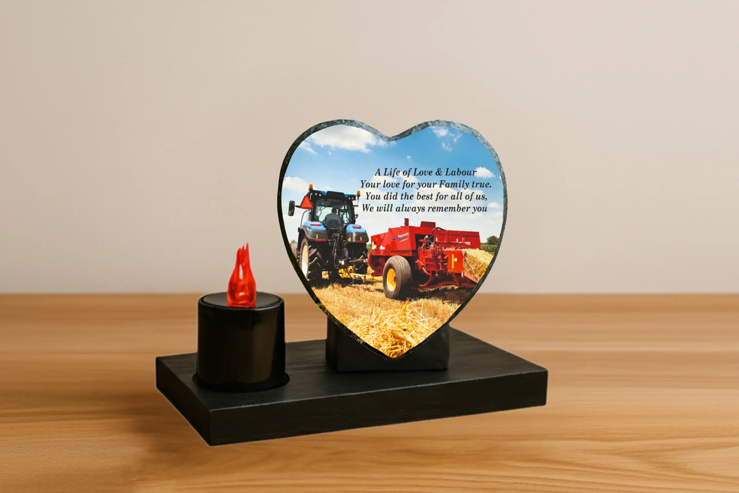 Our memorial plaques are made from real slate with a natural stone uneven texture edge. Slight variations in the size of slate and natural imperfections or pits in the surface, which may be visible in the final print, all give each slate its own distinct and unique features.
