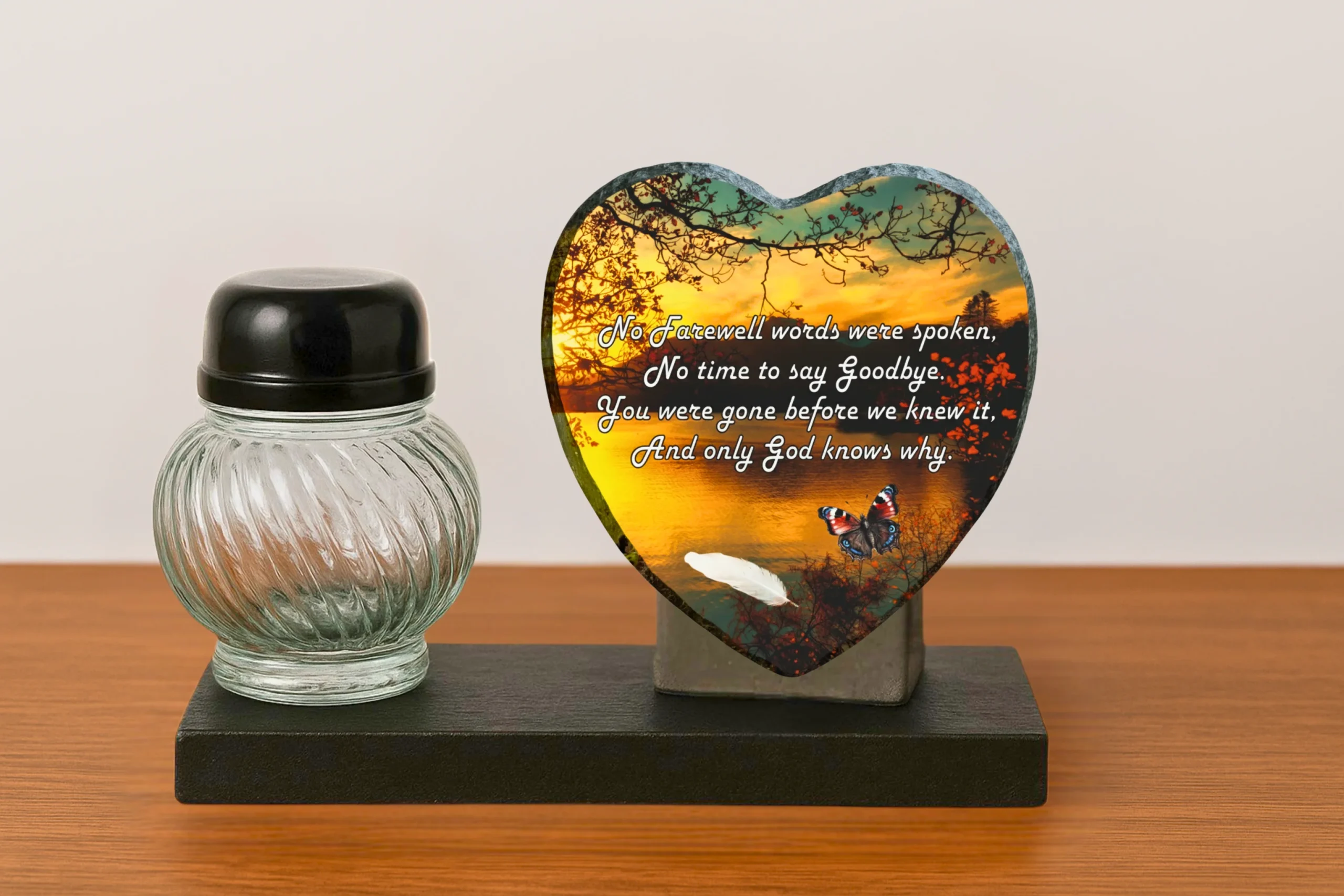 Our memorial plaques are made from real slate with a natural stone uneven texture edge. Slight variations in the size of slate and natural imperfections or pits in the surface, which may be visible in the final print, all give each slate its own distinct and unique features.