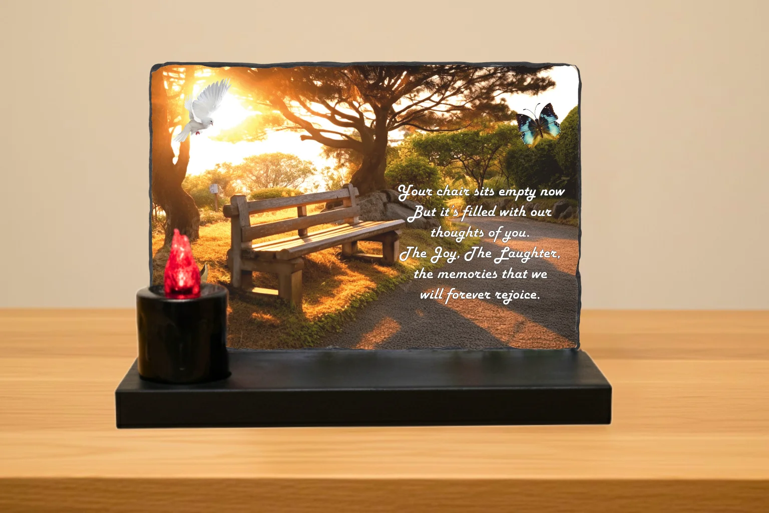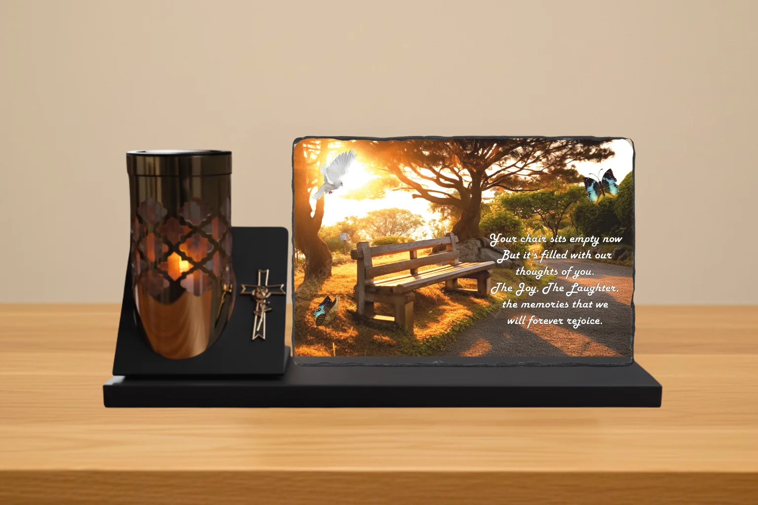 Our memorial plaques are made from real slate with a natural stone uneven texture edge. Slight variations in the size of slate and natural imperfections or pits in the surface, which may be visible in the final print, all give each slate its own distinct and unique features.