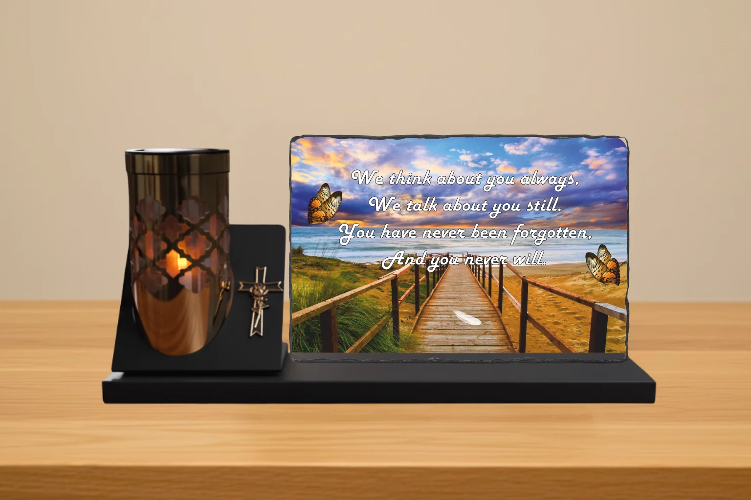 Our memorial plaques are made from real slate with a natural stone uneven texture edge. Slight variations in the size of slate and natural imperfections or pits in the surface, which may be visible in the final print, all give each slate its own distinct and unique features.