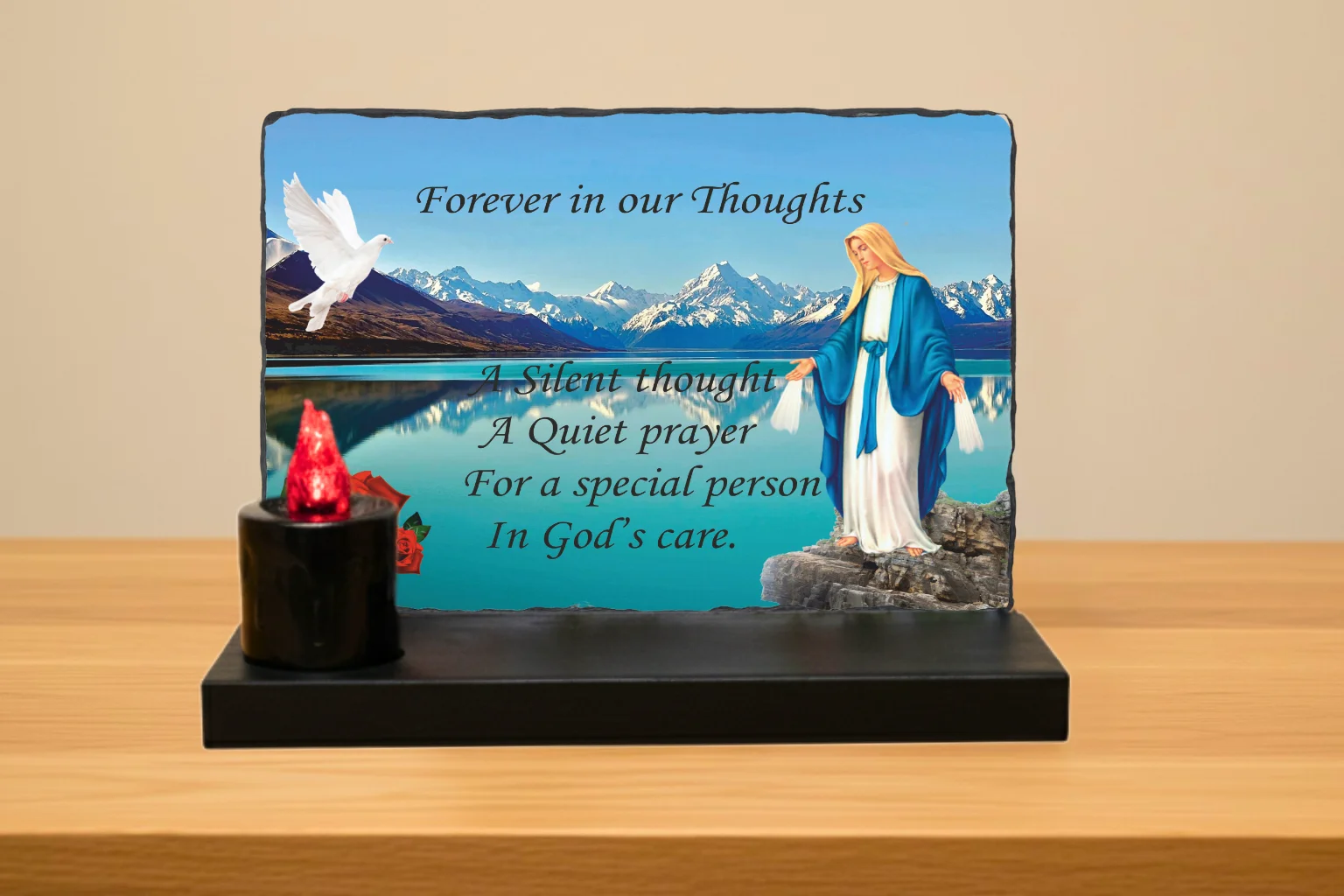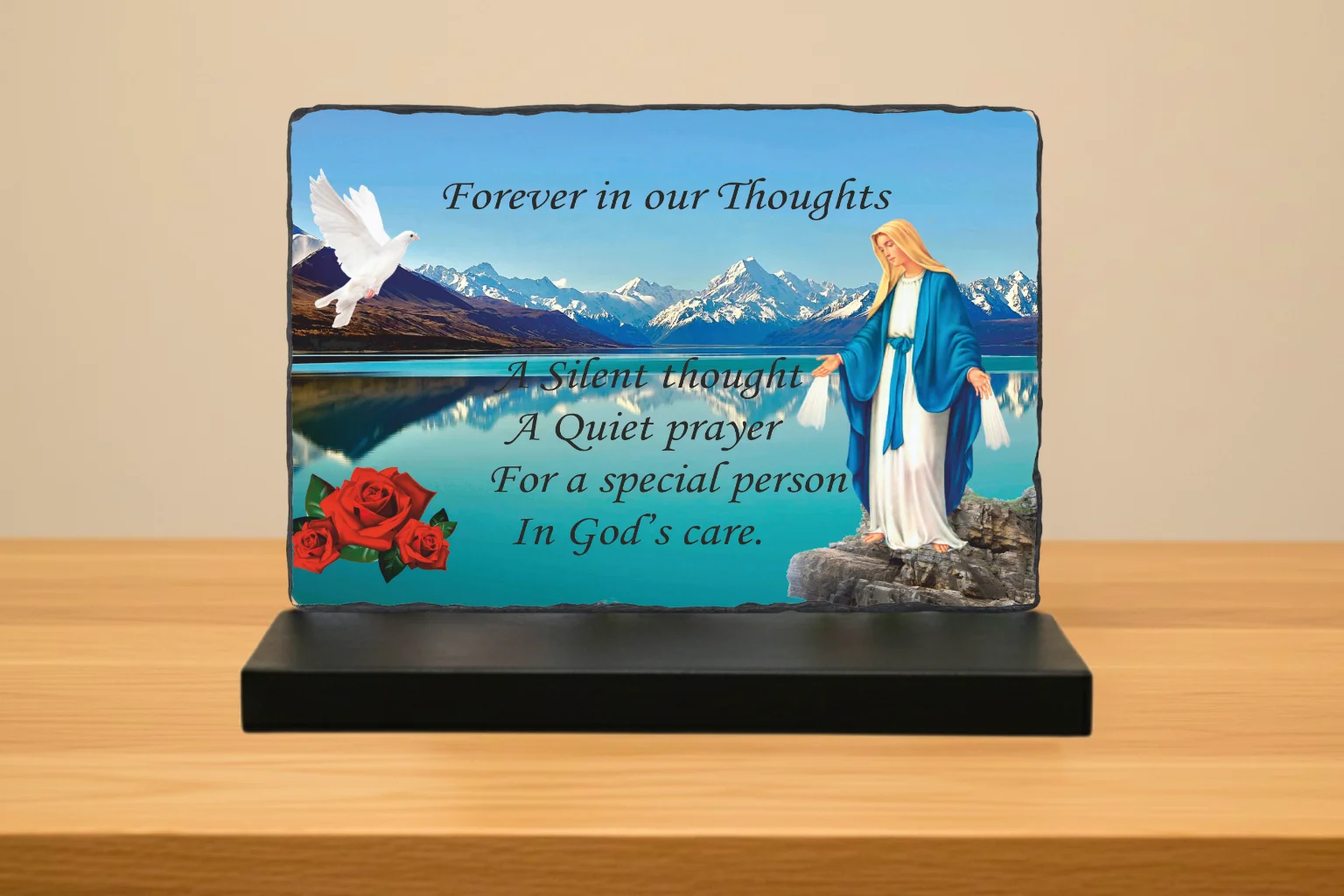 Our memorial plaques are made from real slate with a natural stone uneven texture edge. Slight variations in the size of slate and natural imperfections or pits in the surface, which may be visible in the final print, all give each slate its own distinct and unique features.