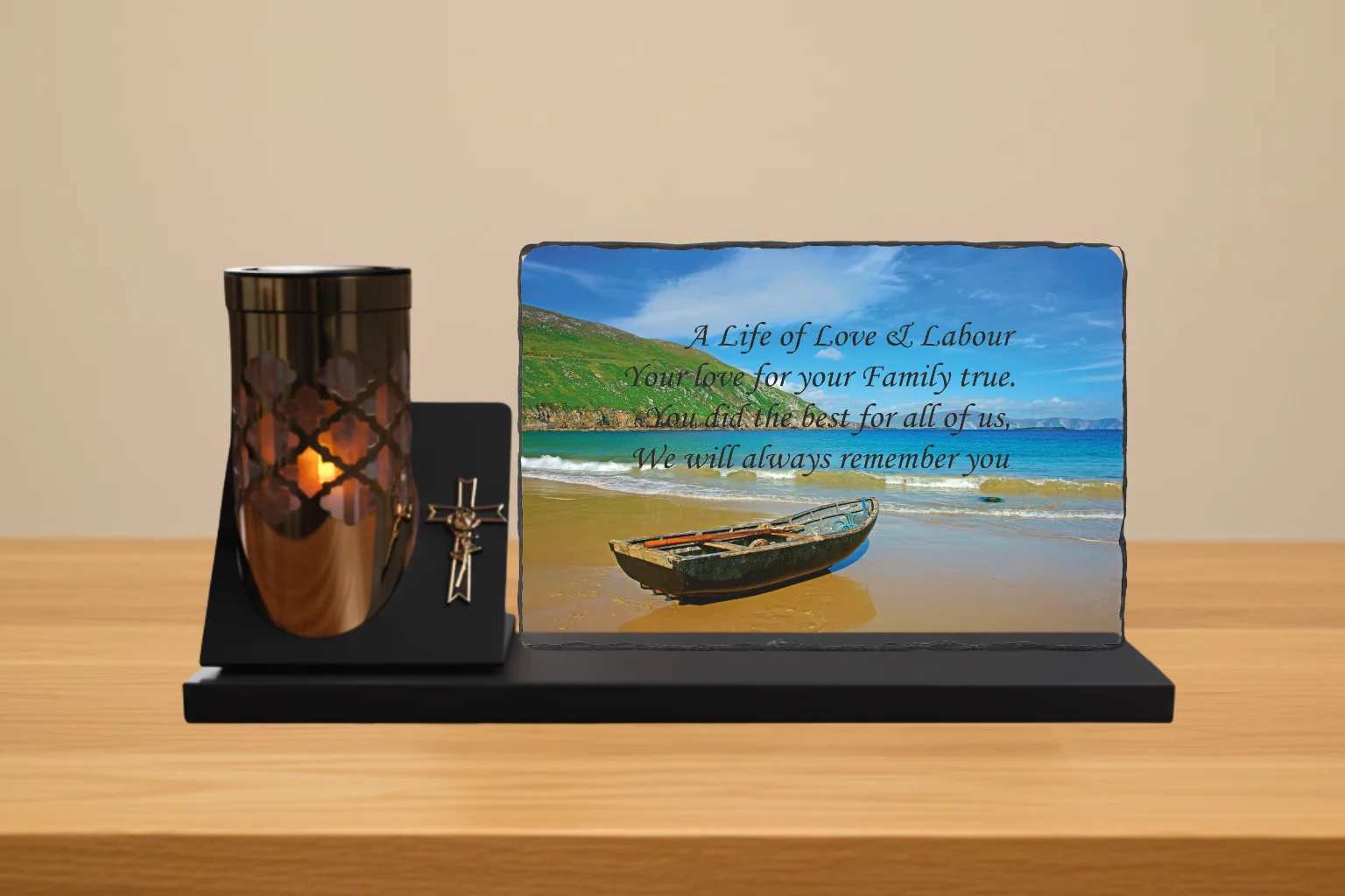 All our Plaques are mounted on a Recycled plastic base, making our product more environmentally friendly and ensuring stability when placed on a loved one’s resting place. Because slate naturally attracts heat and rays from the sun, fading will occur. To help delay this process, all our plaques are UV-coated, prolonging their life against these natural weather conditions.
