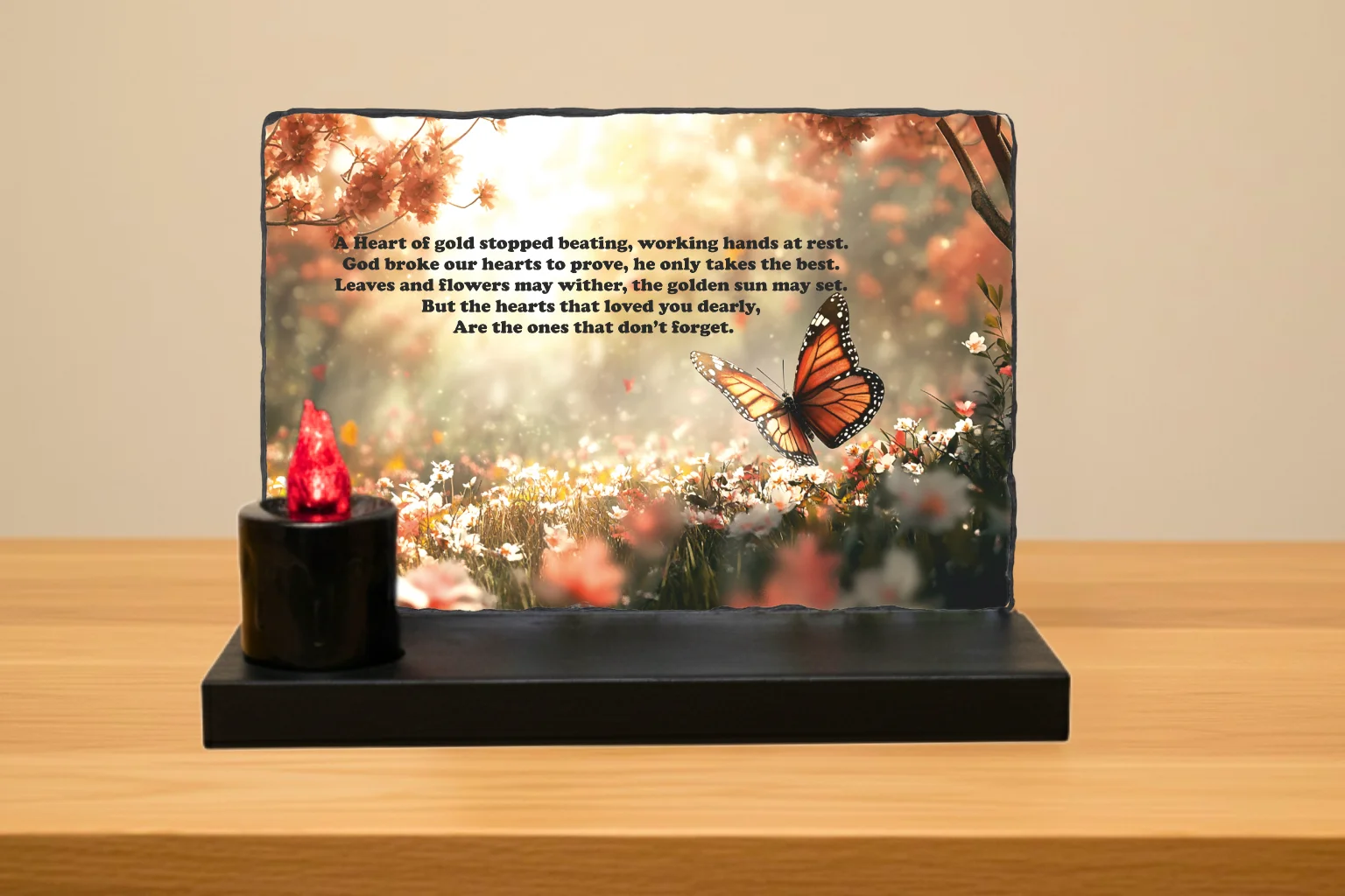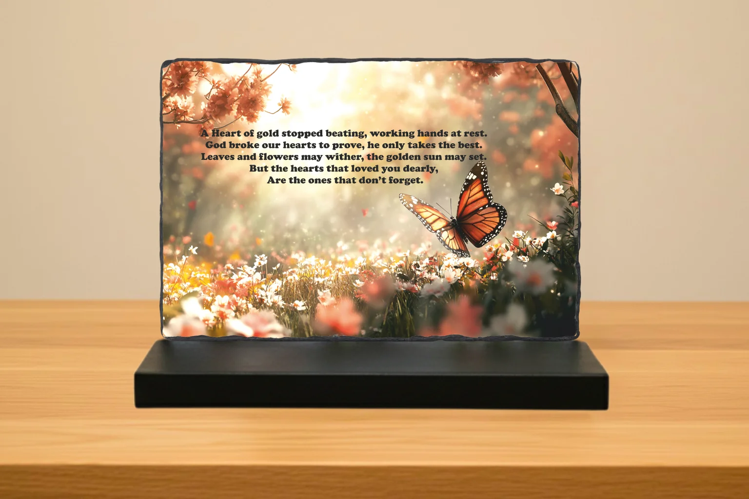 Our memorial plaques are made from real slate with a natural stone uneven texture edge. Slight variations in the size of slate and natural imperfections or pits in the surface, which may be visible in the final print, all give each slate its own distinct and unique features.