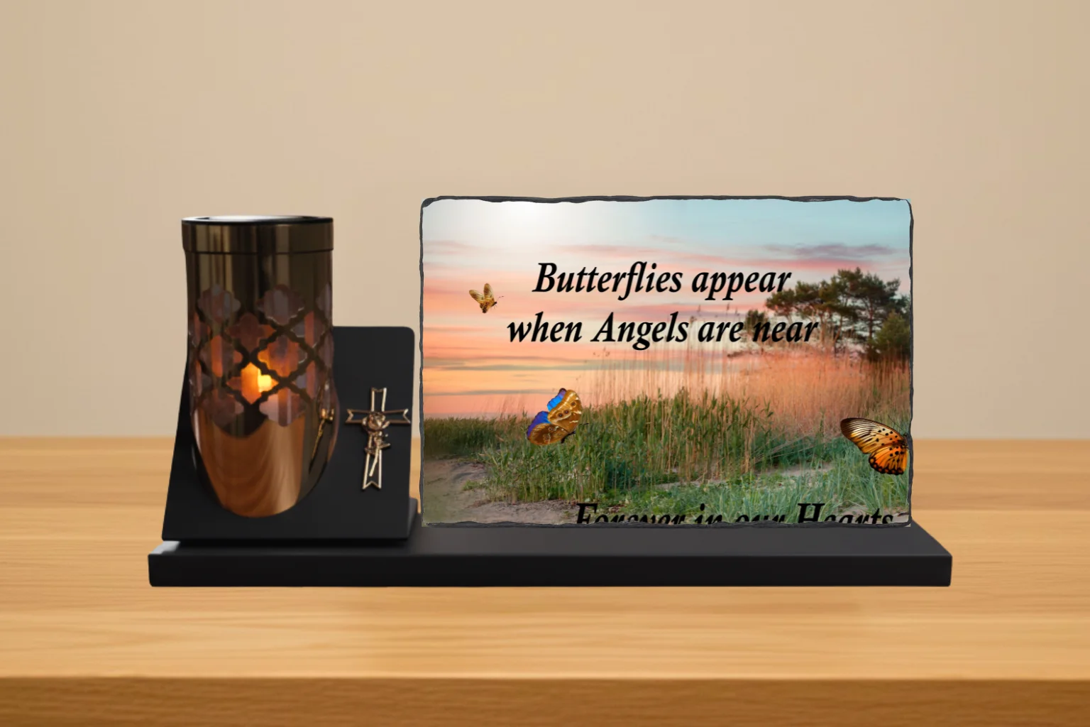 All our Plaques are mounted on a Recycled plastic base, making our product more environmentally friendly and ensuring stability when placed on a loved one’s resting place. Because slate naturally attracts heat and rays from the sun, fading will occur. To help delay this process, all our plaques are UV-coated, prolonging their life against these natural weather conditions.
