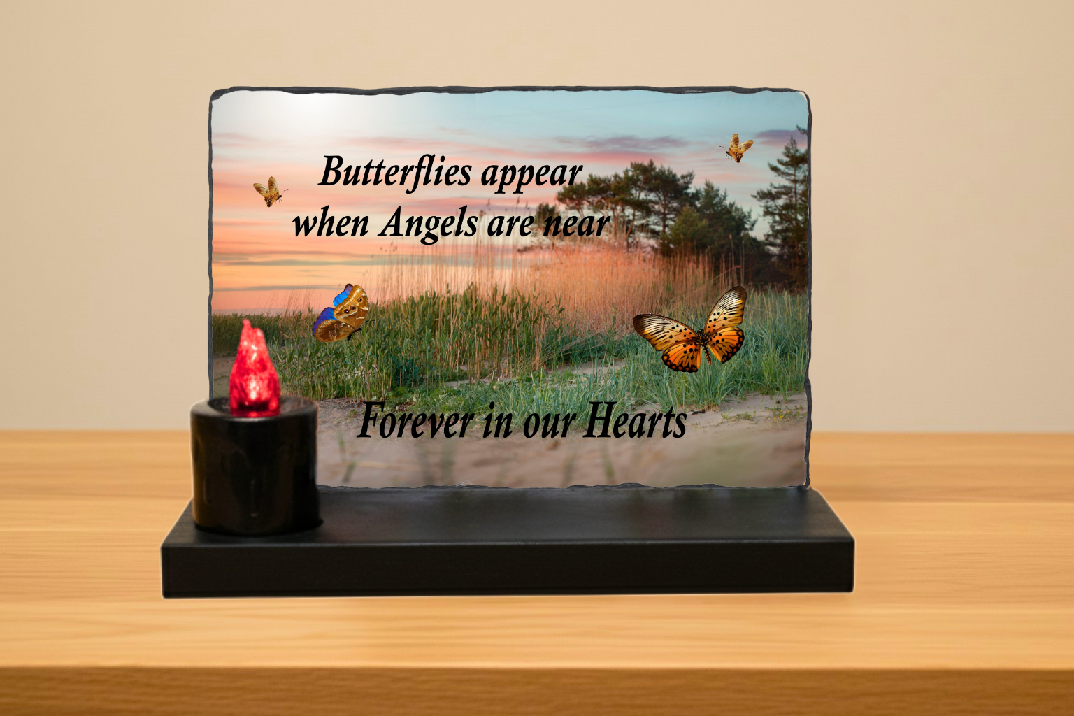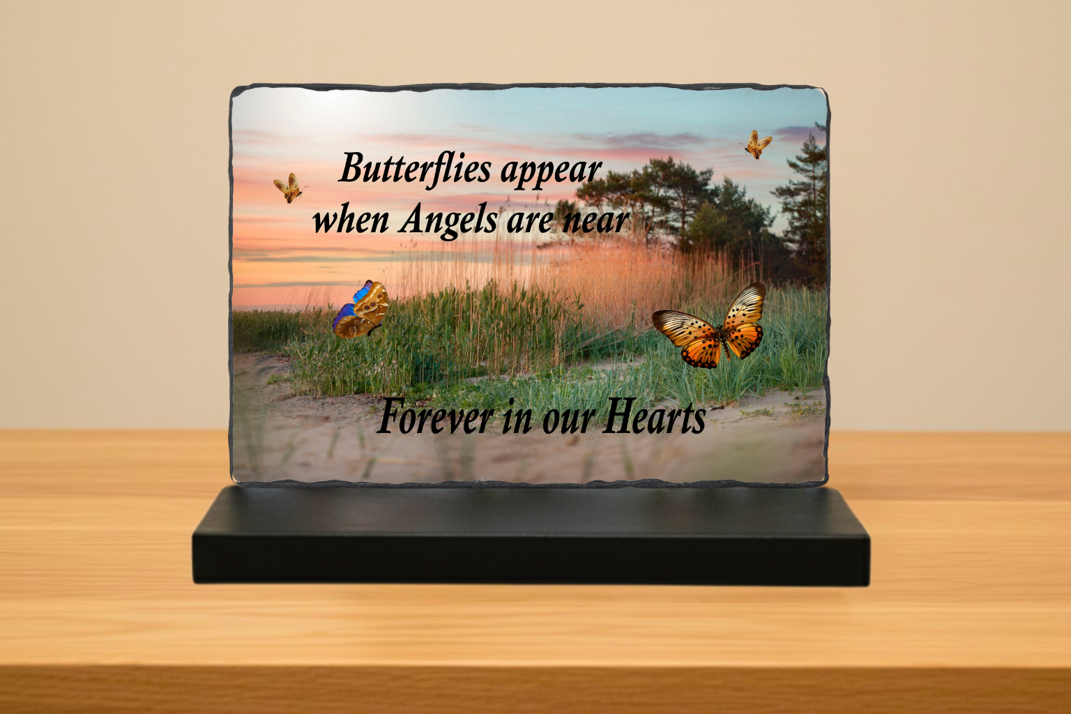Our memorial plaques are made from real slate with a natural stone uneven texture edge. Slight variations in the size of slate and natural imperfections or pits in the surface, which may be visible in the final print, all give each slate its own distinct and unique features.